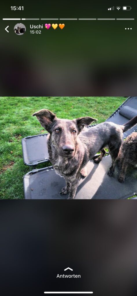 Für unsere wunderschöne Lady suchen wir ein Zuhause, in dem sie endlich für immer ankommen kann. Sie ist eine neugierige, fröhliche Hündin, die gerne spielt und tobt, aber ebenso die Kuschelstunden mit ihren Menschen genießt. Hat sie einmal Vertrauen gefasst, ist sie sehr anhänglich und fordert ihre tägliche Ration an Streicheleinheiten ein. Fremden gegenüber ist sie anfangs vorsichtig und braucht ein bisschen Zeit, um aufzutauen. Sie geht schon toll an der Leine, fährt brav im Auto mit und bleibt in Gesellschaft eines anderen Hundes mehrere Stunden allein zuhause. Sollte im neuen Zuhause ein vorhandener Hund auf sie warten, bevorzugen wir einen Rüden, da sie nicht alle Hündinnen so richtig gut leiden kann und sich das manchmal erst nach Wochen zeigt.
